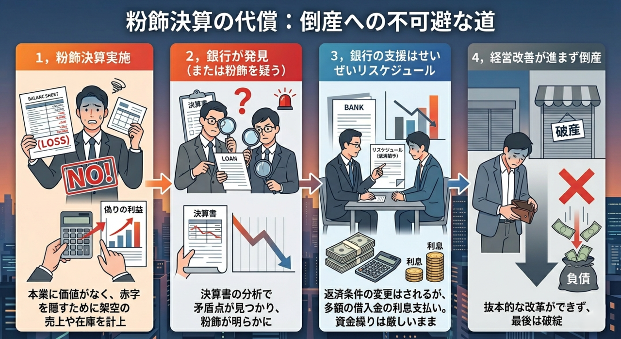 粉飾決算を行なって経営は継続できたとしても、それは経営改善から逃げ単なる延命に過ぎません。先送りすればするほど問題が大きくなります。