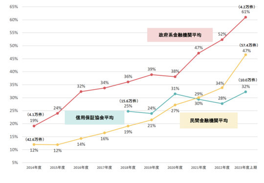 経営者保証に関するガイドラインが運用され始めた頃は、融資全体に占める経営者保証不要融資の割合は低く推移していました(下のグラフを参照)。