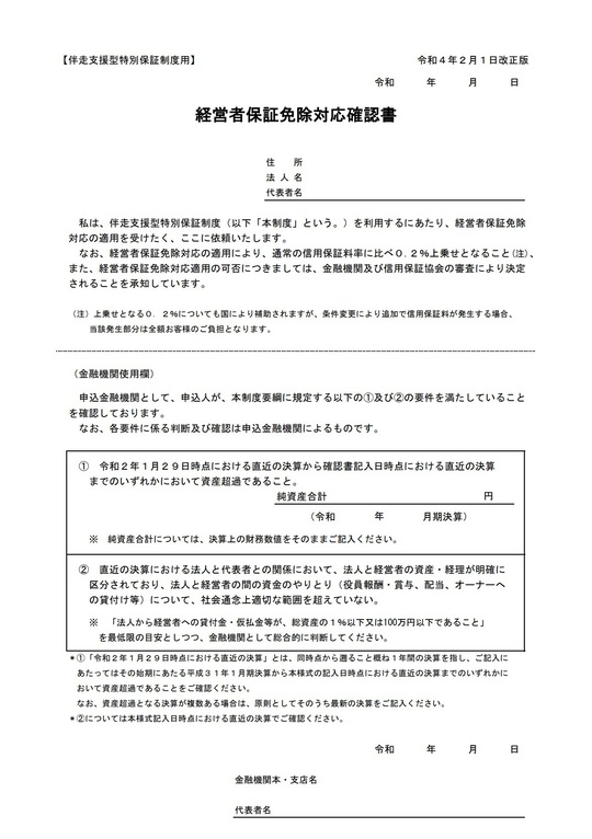 その参考として、伴奏支援型特別保証制度を利用する際、経営者保証免除対応の適用を受けたい場合に提出が必要となる「経営者保証免除対応確認書」があります。愛知県信用保証協会のホームページにある確認書には次のように書かれています。