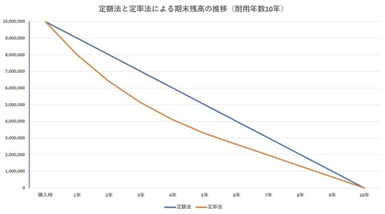定額法は各期一定額で資産価値が減少していきます。つまり、減価償却費も一定です。定率法は購入し事業に使い始めると急激に資産価値は下落します。しかし、徐々に定額法に近づいていき最終的には同額となります。なお、建物、建物附属設備、構築物は定額法のみとなります。