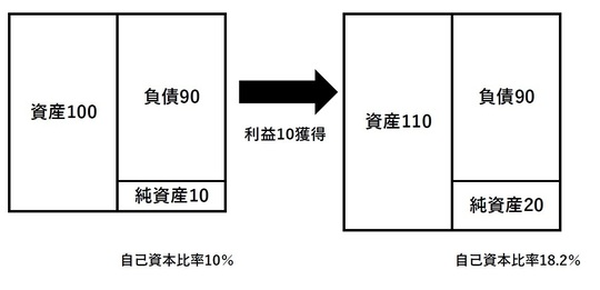 利益を計上すれば貸借対照表の自己資本が増加しますから自己資本比率は向上します。