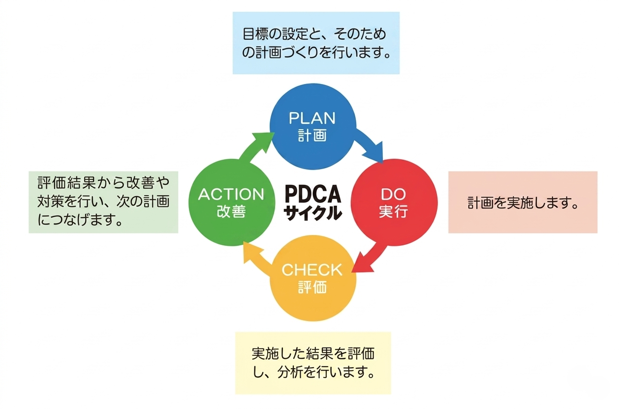 PDCAサイクルという言葉を聞いたことがあるでしょうか。PDCAとは次の言葉の頭文字を指します。