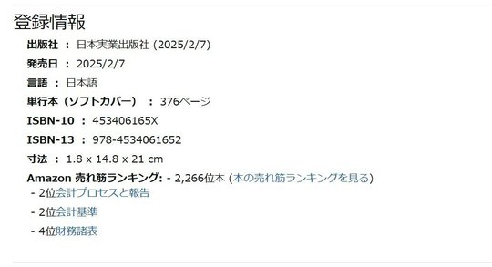 Amazonの売れ筋ランキングを確認したところ、2025年2月15日2時50分頃、全体では2,266位、会計プロセスと報告は2位、会計基準も2位、財務諸表は4位でした。